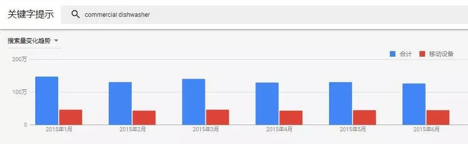 第一步:定位合适的市场 使用 Keywords Planner关键字规划师看市场需求 点击“关键字” — “历史指标”,输入关键词 Commercial Dishwasher (商业洗碗机),查看之前的市场需求。 数据显示,商业洗碗机全年搜索趋势稳定,其中 2 - 4 月的搜索需求稍高。平均搜索量稳定在 1.2 万/月。 点击“地理位置”,看看一些关键市场的产品需求如何。 可以看到,商业洗碗机的产品需求主要集中在欧美与东南亚国家。 因此汇达通确定了自己的产品在海外需求比较大且稳定,先期目标市场确定为欧美与东南亚——离大客户越来越近了。 还是觉得有点复杂?如果你想现在就快速查看适合自己产品的目的地市场,直接问问 Google 全球商机通,可手机直接访问。