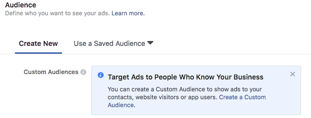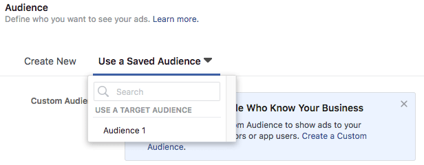 要创建已保存的受众群体列表,请在广告管理器中选择“使用已保存的受众群体”选项,然后根据所有可用的定位选项创建受众群体列表: