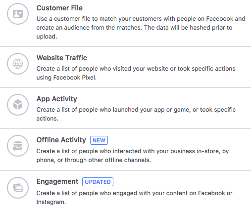 从以下五个选项中进行选择,以吸引已与您的业务建立关系的人员。这些可以是现有客户,潜在客户或在Facebook上与您的业务进行过互动的人: