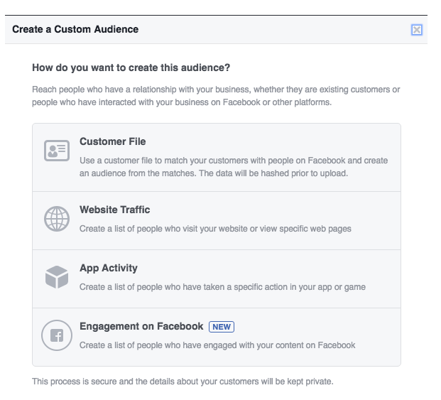 Facebook还为您提供了在Custom Audiences定位广告的选项 - 那些已经了解您业务的人。您可以创建自定义受众群体列表,向已在您的联系人中的用户展示广告,其中包括您的网站访问者或当前的应用用户。
