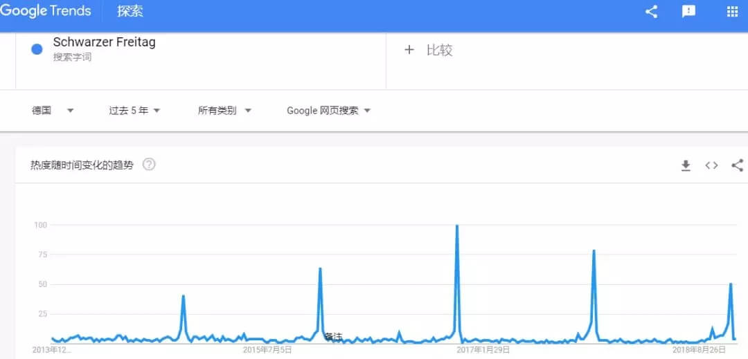 黑色星期五是海外的购物狂欢节,相当于中国的“双十一”,实体店和网上商店在黑色星期五会提供特别折扣,现在这个做法在全球各个市场越来越受欢迎。事实上,根据 Google Trends 的数据,我们可以看到德国消费者对“黑色星期五”的兴趣越来越浓,近几年,每年的黑五期间消费者对黑五的搜索都会出现峰值。( Schwarzer Freitag 是德语的“黑色星期五”)